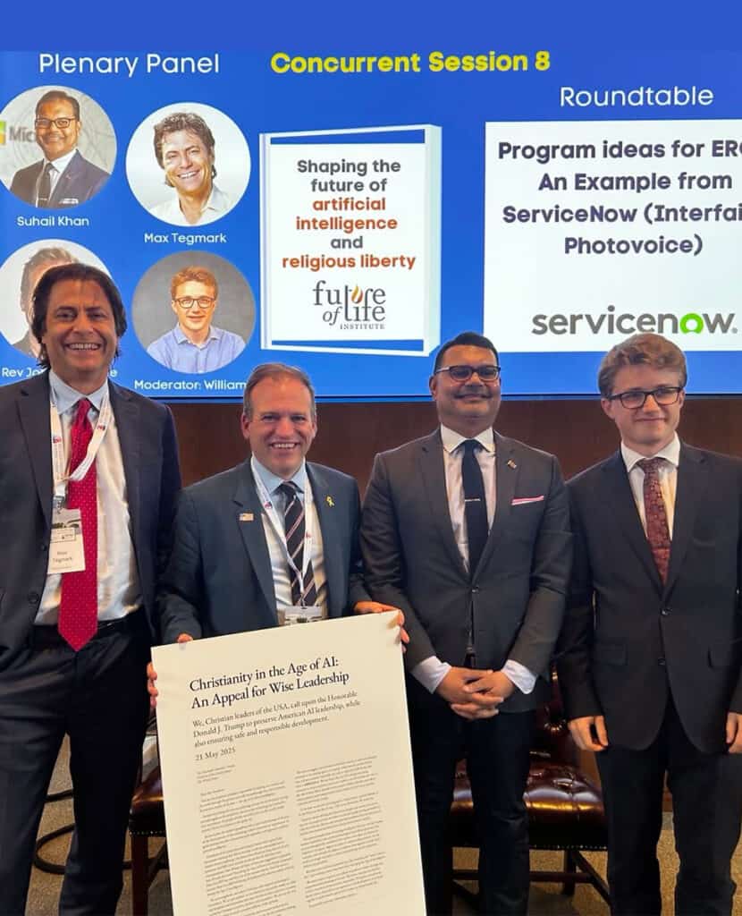 FLI President Max Tegmark joined evangelical leader Rev. Johnnie Moore and Microsoft religious freedom advisor Suhail A. Khan in a panel, moderated by FLI religions lead Will Jones, exploring the implications of AI for religious liberty and the need for faith leaders to step up. The panel took place at the Religious Freedom and Business Foundation's 'Dare to Overcome' conference at CUA. The event also saw the launch of Rev. Moore's evangelical leaders' AI letter to President Trump (pictured).